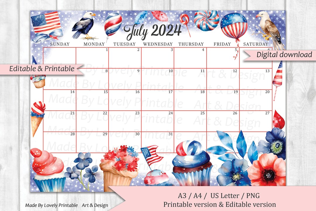 EDITABLE July 2023 Calendar 4th of July Independence Day Etsy