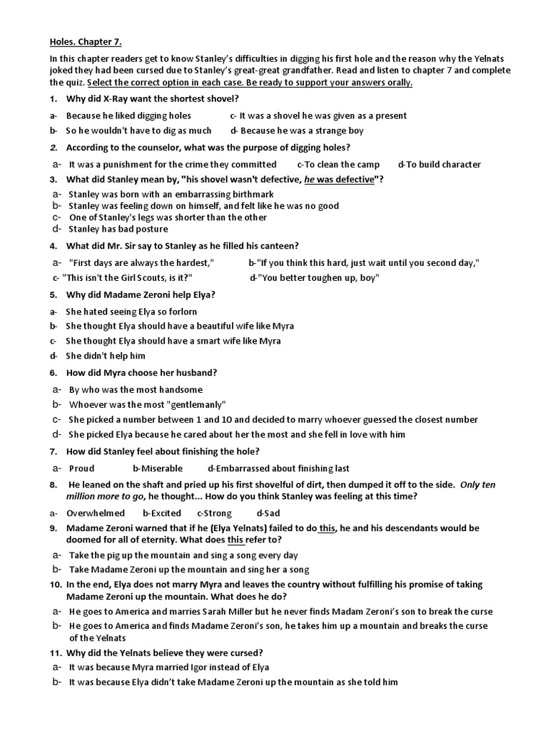 Web the resource contains 15 separate comprehension activities that cover the chapters in groups of two or three,. The first revelation is that there is. Chapter 13 symbols holes 9: For what crime is stanley wrongly convicted? What is zero's real name? Why does camp green lake. Why does the yelnats family have bad luck? Web why does camp green lake force the campers to dig holes? Web this is a thorough holes novel study unit including 180 vocabulary words with quizzes, reading comprehension questions. Web quote analysis holes 7: