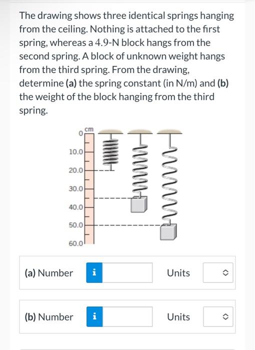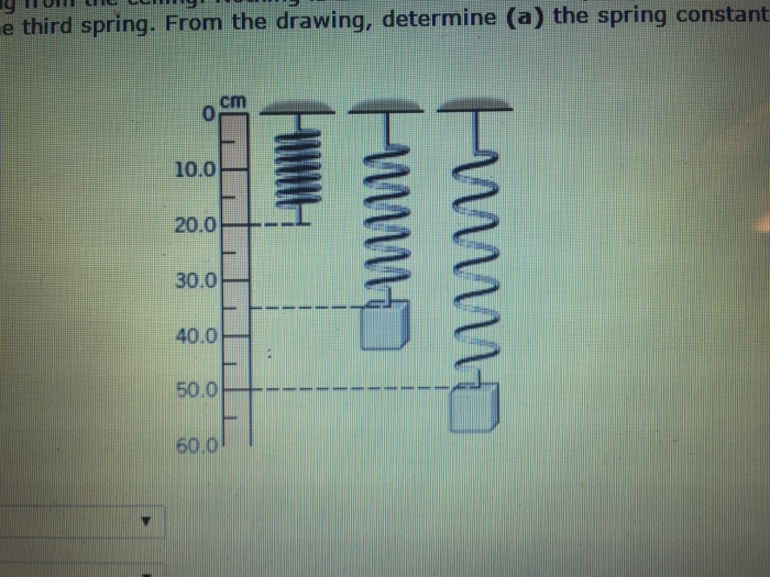 Unstretched length of the spring, = 20.0cm = 0.2m. Web the drawing shows three identical springs hanging from the ceiling. Web the drawing shows three identical springs hanging from the ceiling. Where w is the weigth of the block in the second spring and is the force of that spring. A) to find the spring constant, we'll use the formula.